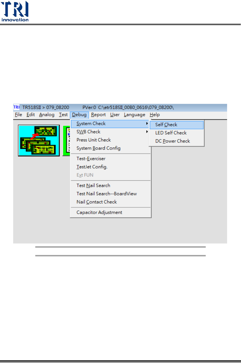 1. 從 TR518 SII 主畫面, 尋找路徑: DEBUG > SYSTEM CHECK > SELF TEST