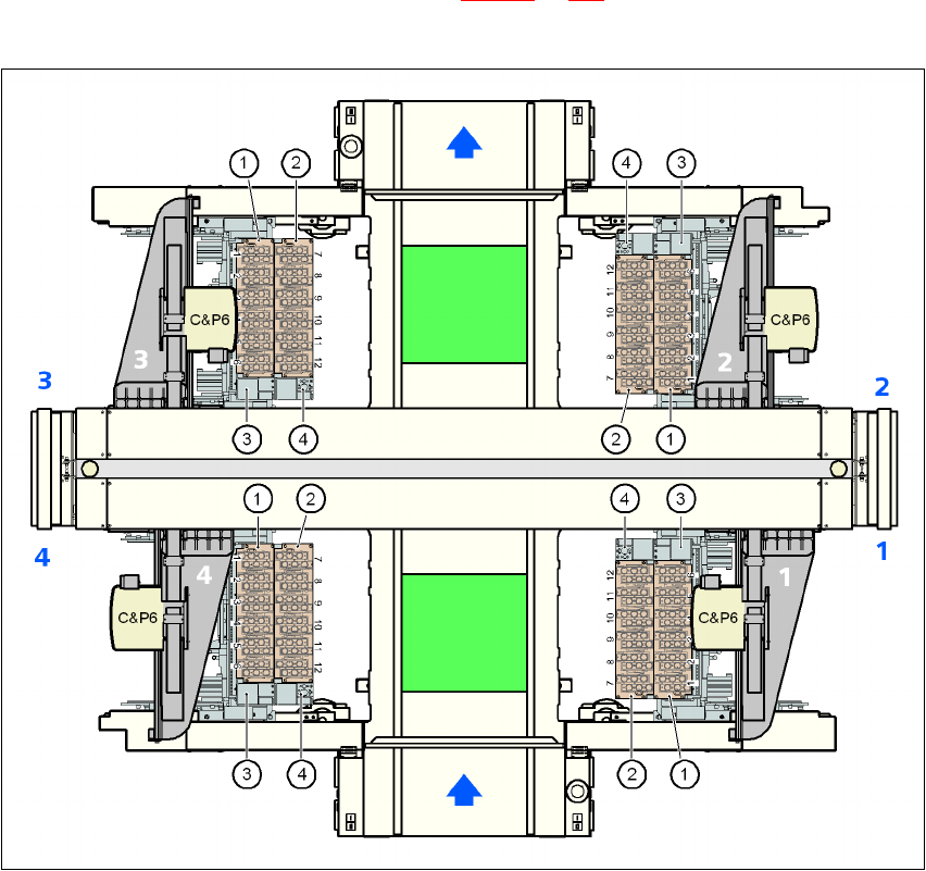 6 Jaama laiendamine Kasutusjuhend SIPLACE X-Seeria 6.1 Imiotsakute vahetusmehhan ism Tark varaversiooni SR.605.xx põhjal 07/2008 EE väljaanne 390 6.1.3.4 C&P6 tööpea imiotsakut e vahetusmehhanismide asukoht masinas X…