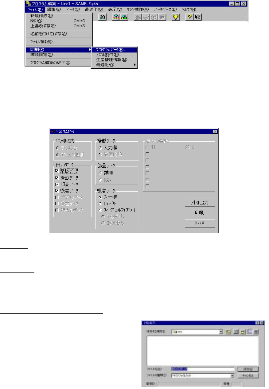 4 – 10 4-2-6. 印刷 印刷 印刷 印刷 編集対象のファイル,最適化で分割したノズル情報または,生産管理情報を印刷します。 印刷を選択すると画面は次のようになります。 プログラムデータは,プログラム編集で作成したデータを,生産管理情報は,生 産実行後の管理情 報を印字します。 4-2-6-1. プログラムデータ プログラムデータ プログラムデータ プログラムデータ プログラムデータを選択すると下図のようにダイアログが表示さ…