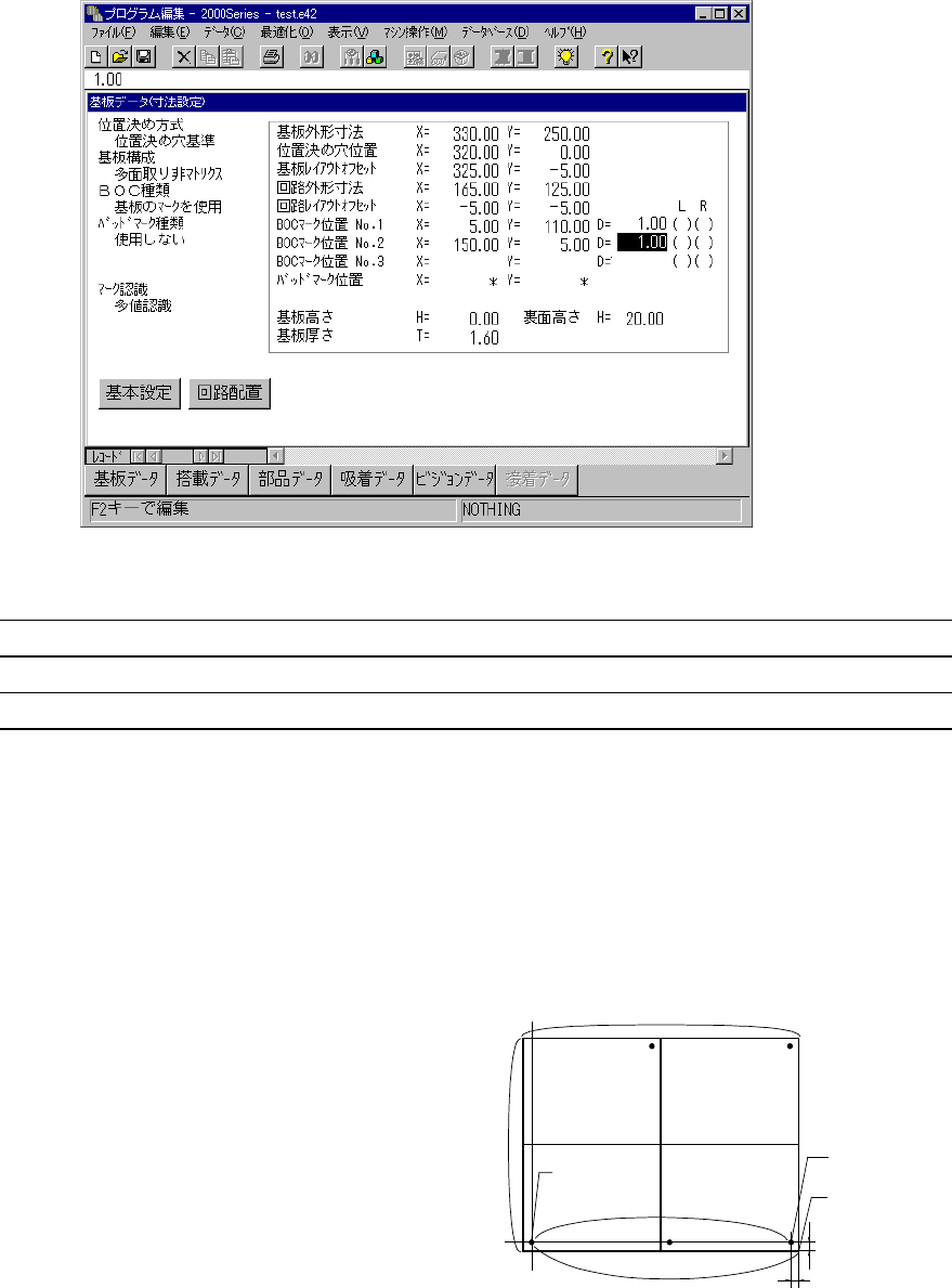 4 – 39 ⑨ BOC マーク位置 マーク位置 マーク位置 マーク位置 No. 1 ∼ ∼ ∼ ∼ BOC マーク位置 マーク位置 マーク位置 マーク位置 No. 3 基本設定で BOC 種類を“基板のマ ークを使用” とした場合は,基板 位置基準か ら BO C マー クの中心点までの寸法を入力します。 基本設定で BOC 種類を“回路毎の マークを使用 ”とした場合は,回 路位置基準 から BO C マ ークの中心点までの寸法…