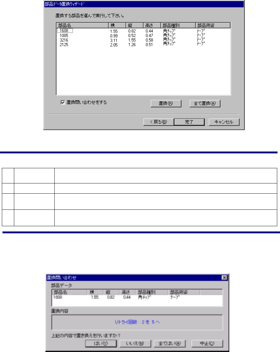 ”置換”ボタンの選択により、選択状態の部品の設定のみの置き換えを実行します。