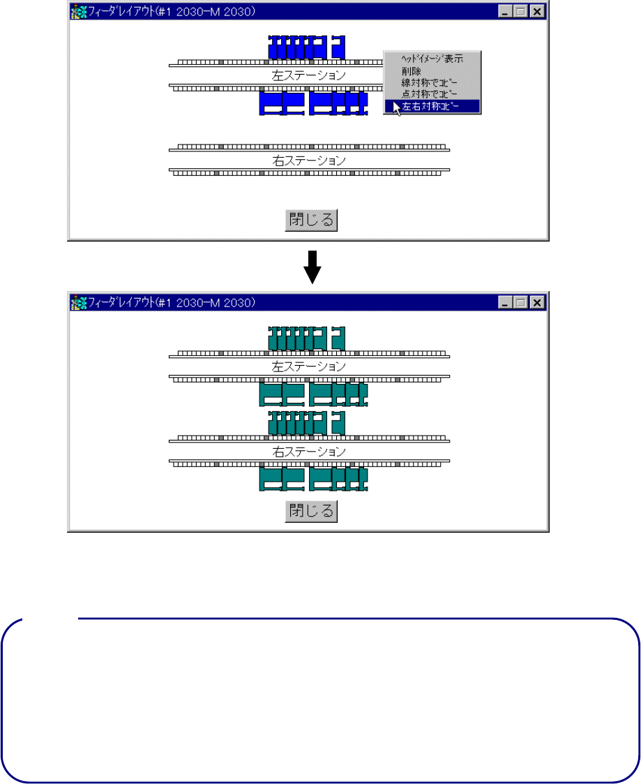 4 - 151 左ステーションのフィーダを選択した場合は右ステーションへ、右ステーション のフィーダを選択し た場合は左ステーションへ、選択したフィーダと同じ穴位置にコピーします。 図 図 図 図 4-1 1-1-18 左右対称コピー 左右対称コピー 左右対称コピー 左右対称コピー • 2030ステーション以外は、メニュー項目がグレー表示となり、選択できません。 • 常設部品および、トレイ部品は、コピーされません…