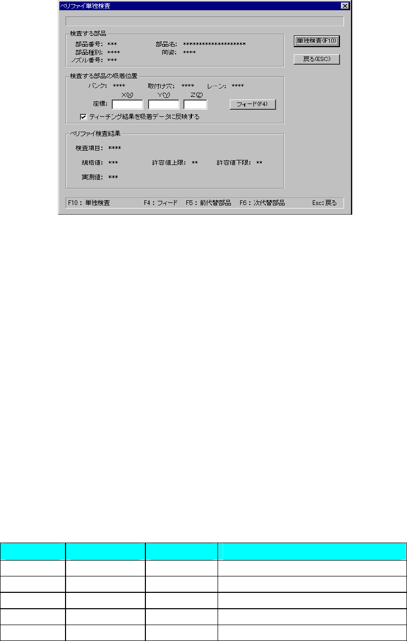 7 – 111 7-7-1-3-3. 単独検査中ダイアログ 単独検査中ダイアログ 単独検査中ダイアログ 単独検査中ダイアログ “図 7-7-1-3- 2. 「単独 検査実行ダイアログ 」”を実行 すると以下のダ イアログが表示され ます。 図 図 図 図 7-7-1-3-3 単独検査中ダイアログ 単独検査中ダイアログ 単独検査中ダイアログ 単独検査中ダイアログ ・ 検査中の部品 検査中の部品の内容を表示します。 ・ 検査中の…