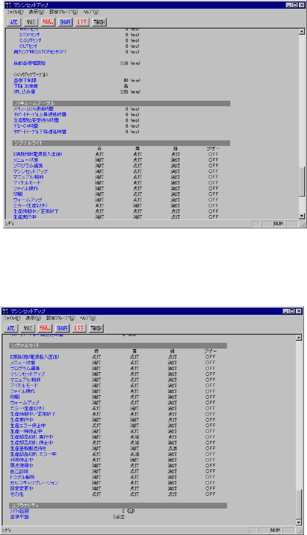8 - 4 「 「 「 「バキュームテーブル バキュームテーブル バキュームテーブル バキュームテーブル」、「シグナルライト」の現在設定状況 」、「シグナルライト」の現在設定状況 」、「シグナルライト」の現在設定状況 」、「シグナルライト」の現在設定状況 図 図 図 図 8-1- 1-5 マシンセットアップ初期画面5 マシンセットアップ初期画面5 マシンセットアップ初期画面5 マシンセットアップ初期画面5 「シグナルライト」「コ 「シグ…