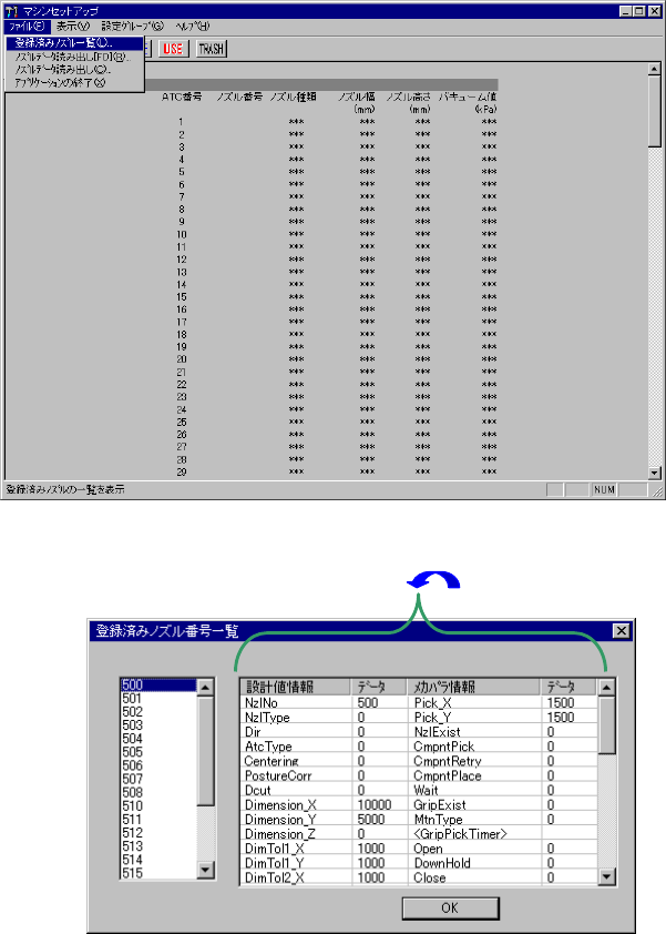 メニューバーの[ファイル]から[登録済みノズル一覧]を選択すると登録済みノズル番号一覧ダ