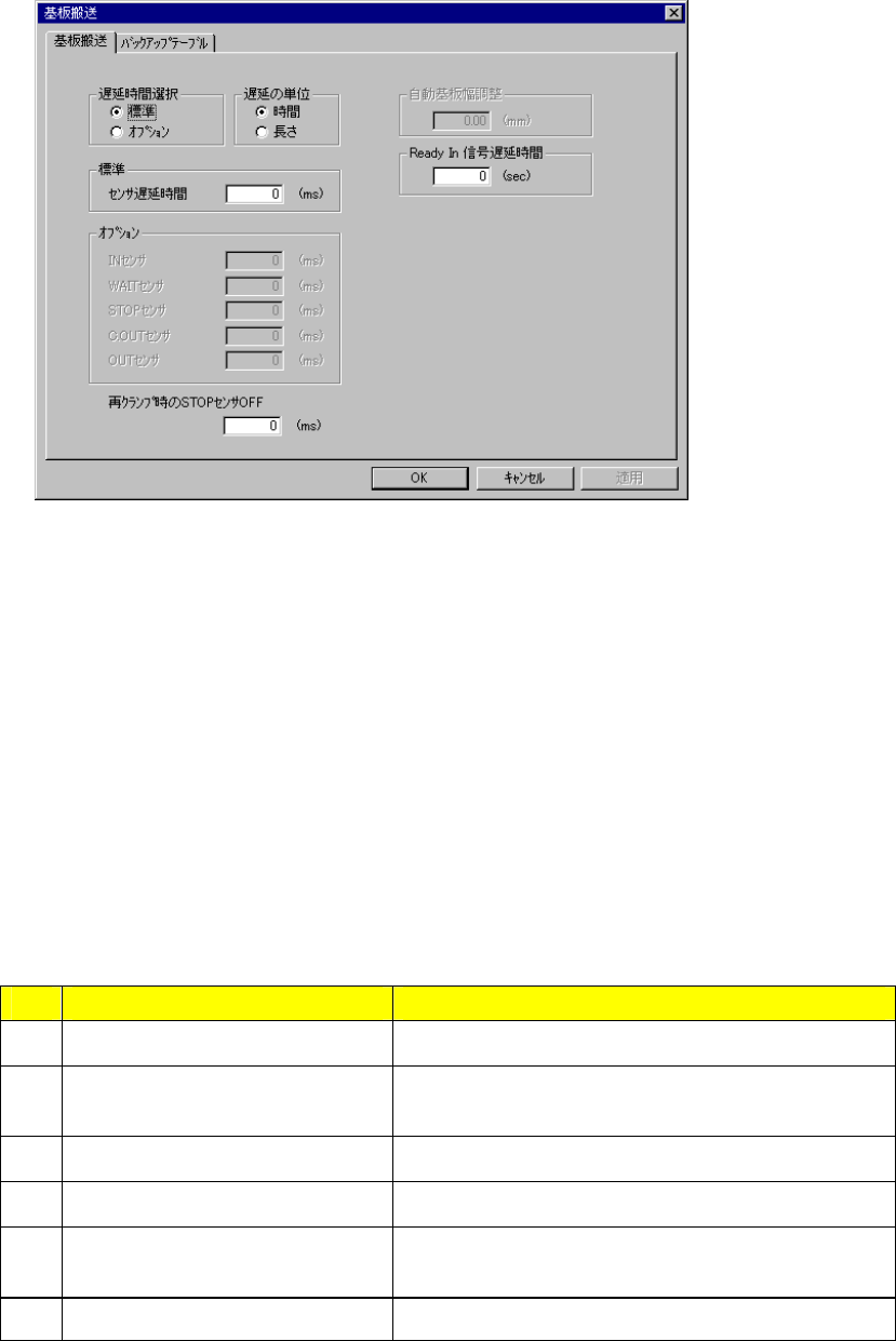 8 – 39 (2) 設定方法 ① 延時間選択 ラジオボタンによりセンサ遅延時間の設定方法を変更します。 ・標準 :全センサに対して共通の遅延時間設定を行います。 ・オプションセンサ :個別に遅延時間設定を行います。 ② 遅延の単位 ラジオボタンにより、遅延の単位を設定します。 ”時間”を選択すると、基板搬送センサ遅延で設定した値を ms として扱い、 遅延します。 ”長さ”を選択すると、…