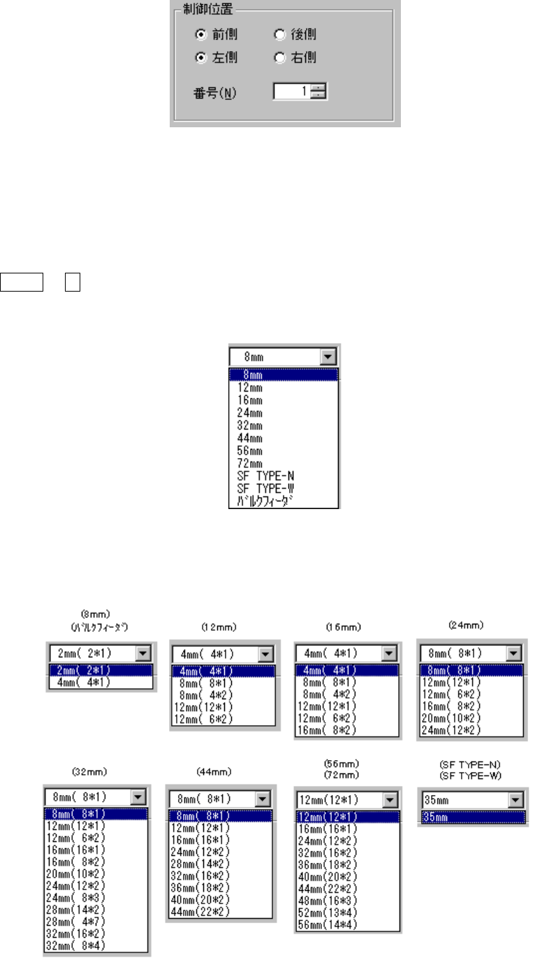 制御項目で“テープ送り動作”を選択したときは、テープ幅とピッチをコンボボックスにより選択