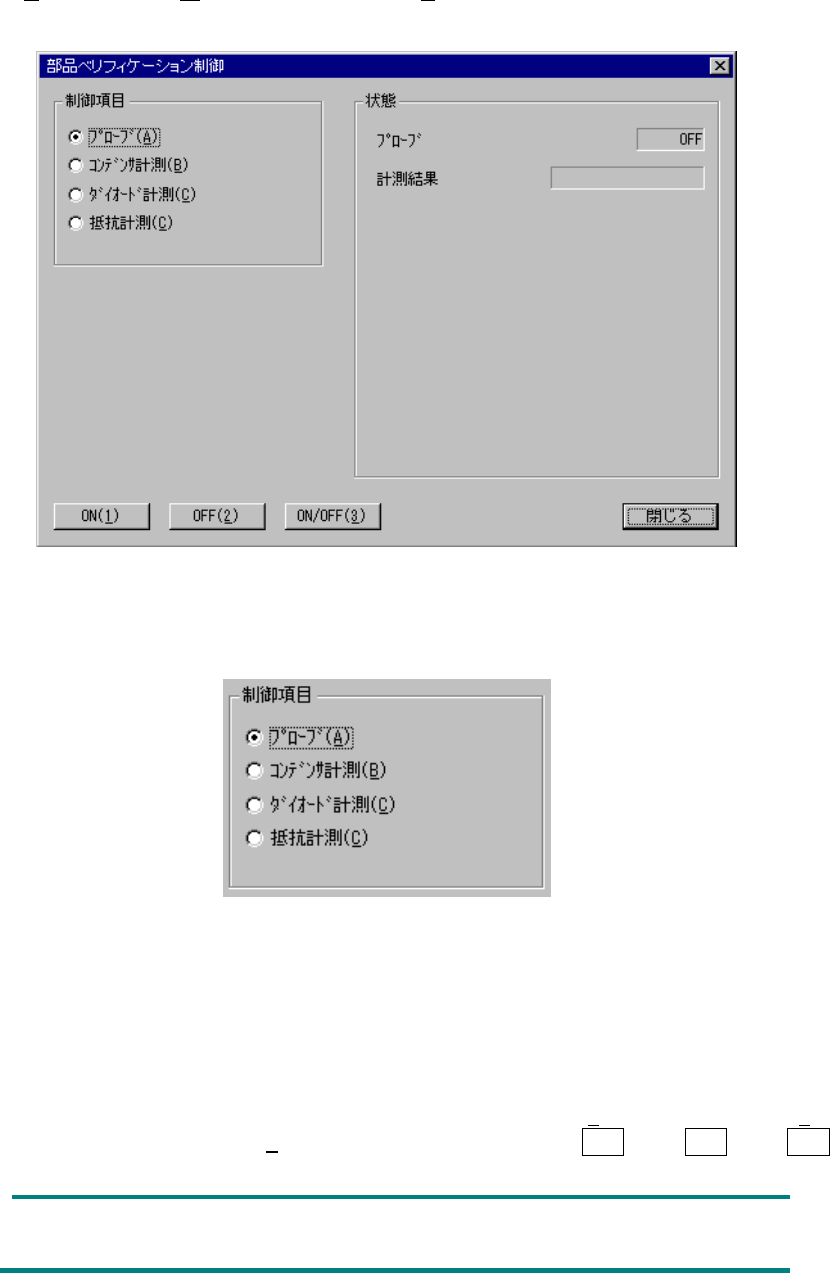 9 - 53 2 ) コンデンサ計測 コンデンサ部品の容量を計測します。 制御項目の“コンデンサ計測”がチェックされて いるときに<計測( 1 )>ボタン、<モ ード( 2 )>ボタン、<プローブ( 3 )>ボタンを選 択するかまたは 、 F3 キー 、 F4 キ ー、 F5 キーを押して制御します。 状態表示は、制御完了時に更新されます。 3) ダイオード計測 ダイオード部品の容量を計測します。 制御項目の“ダイオード計測…