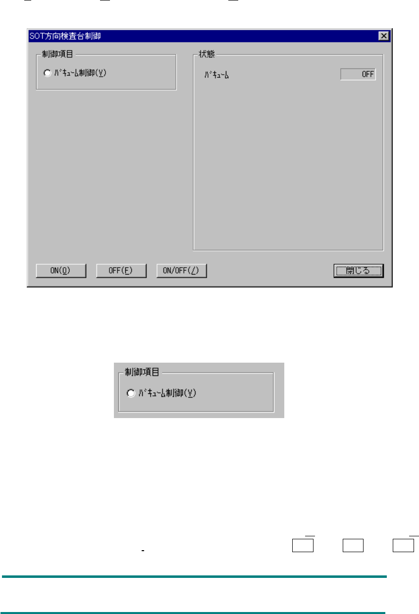 9 - 54 9-6-4. SOT 方向 方向 方向 方向検査台 検査台 検査台 検査台 [制御( C )][その他 (O)] [SOT方向検査台(V) ... ]を選択すると、下記のSOT方向検 査台のダイアログが表示されます。 図 図 図 図 9-6- 4 SOT 方向検査台 方向検査台 方向検査台 方向検査台ダイアログ ダイアログ ダイアログ ダイアログ (1) 制御項目 制御項目をラジオボタンにより選択します。 (2) 制御…