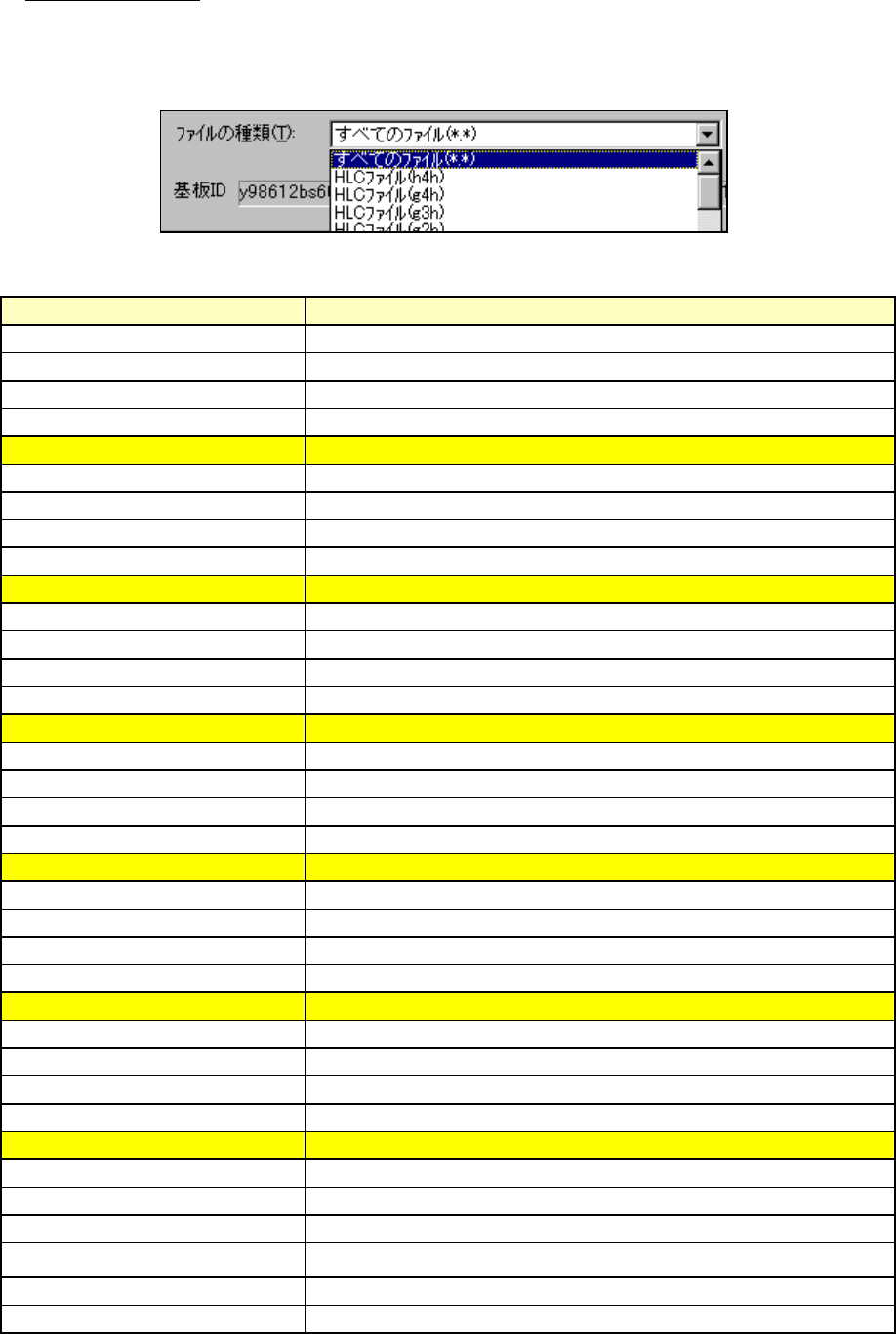 4 – 7 ファイルタイプ指定 ファイルタイプ指定 ファイルタイプ指定 ファイルタイプ指定 ファイル名のウィンドウに表示するファイルのタイプを変更します。 生産プログラムが作成された時のファイルタイプで保存されていますので,ファ イルタイプ一覧を 参照してファイルタイプを選択します。 ファイルタイプ一覧 ファイルタイプ一覧 ファイルタイプ一覧 ファイルタイプ一覧 ドロップダウンリストボックス表示 プログラムファイル説明 すべ…
