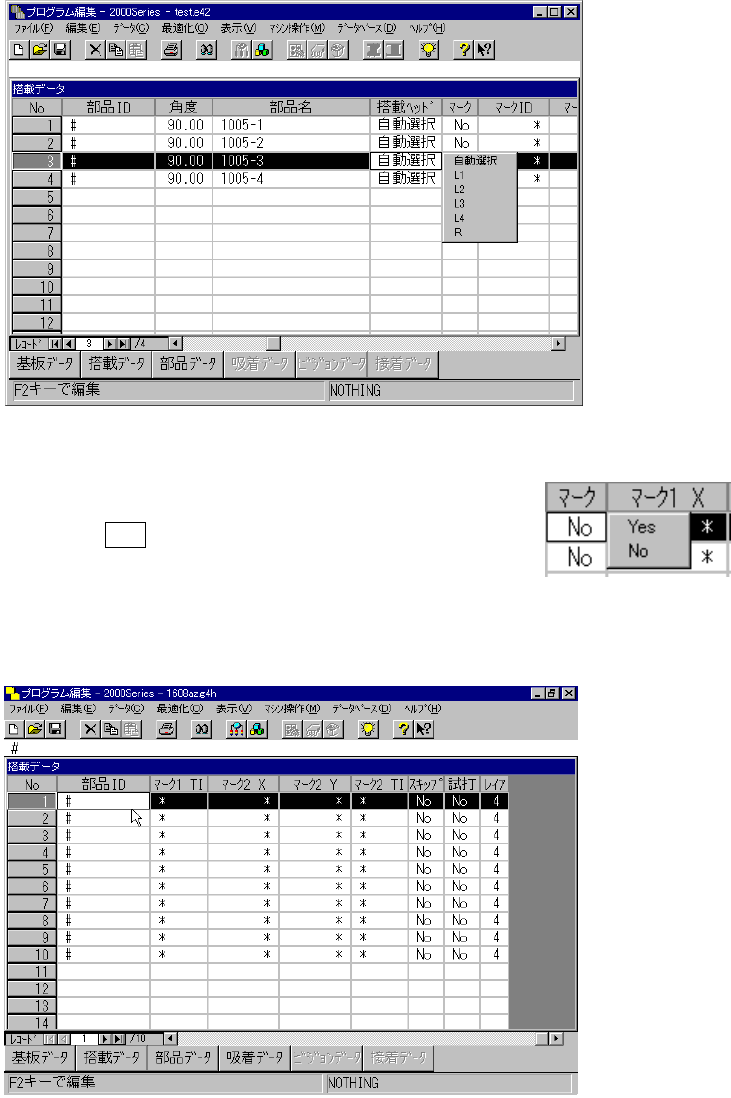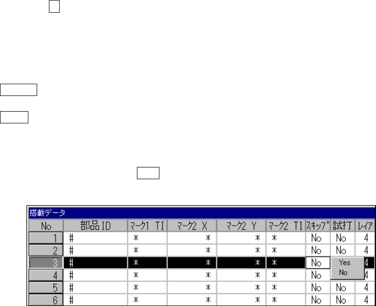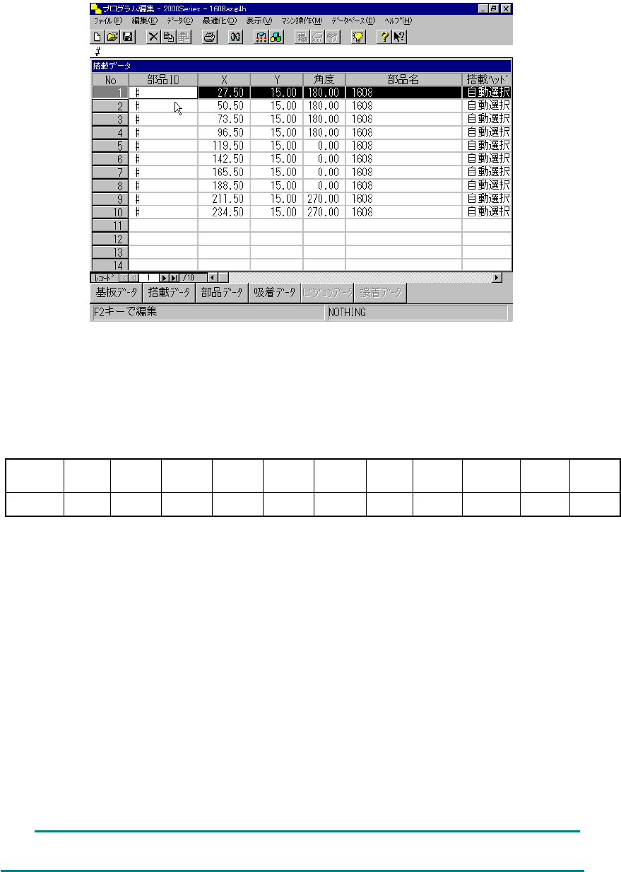 4 – 47 4-6-2. 入力方法 入力方法 入力方法 入力方法 搭載データ画面 搭載データ画面 搭載データ画面 搭載データ画面 詳細 詳細 詳細 詳細 ① 部品 部品 部品 部品 ID 部品 ID を数式バーで入力します。本項を入力すると デフォルト値が入る項目に はデフォル ト値が適用され表示されます。入力の不必要な項目は, * が表示されます。 デフォルト値 デフォルト値 デフォルト値 デフォルト値 搭載ヘッド マ…