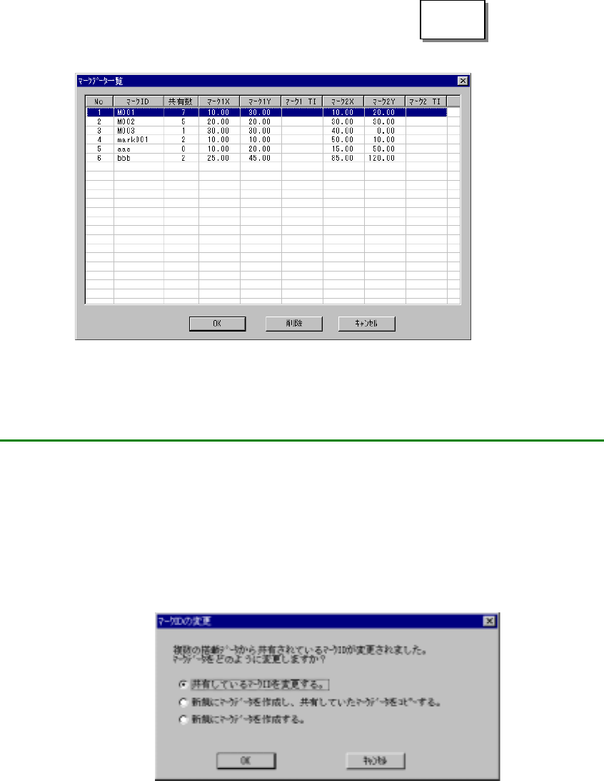4 – 50 ◇ 問い合せ画面で選択した結果により搭載データとマークデータの状態が以下の様に変ります。 例: 3 つの搭載データで 1 個のマークデータを共有している状態で、搭載データ 02 でマーク ID を “ AAA ”に変更した場合 マーク ID 変更前の状態 搭載データ01 搭載データ02 搭載データ03 M001 ・・・共有マーク データ X: △△ ,Y: □□ ,TI:● マークID マークデータ …