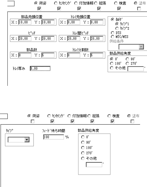 4 - 57 3) トレイが設定された場合のタックコントロール部 4) バルクが設定された場合のタックコントロール部 部品荷姿を変更すると,吸着データの供給指定は自動選択となります。 ④ 部品横方向長さ,部品縦方向長さ 部品の外形寸法を数式バーで入力します。 入力範囲 : 0.01 ∼ 150.00 m m です。 ⑤ 部品高さ 部品の高さを数式バーで入力します。 入力範囲 : 0 ∼ 25.00 m m です。 ⑥ その他寸法 吸着深…
