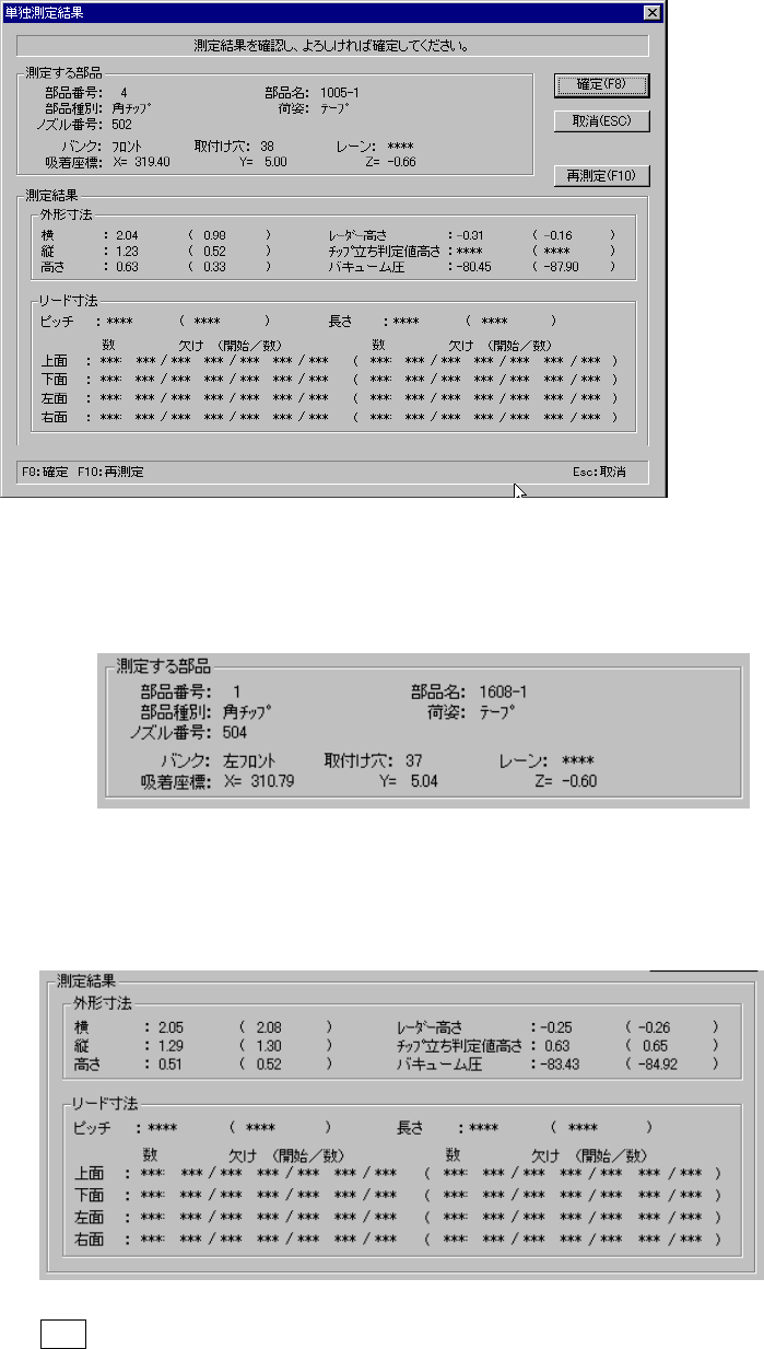 4 - 167 (3) 単独測定結果 単独測定が終了すると以下の結果ダイアログが表示されます。 図 図 図 図 4-12- 2-4-2-6 単独測定結果ダイアログ 単独測定結果ダイアログ 単独測定結果ダイアログ 単独測定結果ダイアログ 1) 測定する部品 部品内容および吸着位置が表示されます。 2) 測定結果 測定した結果の値が表示されます。( )内は元の部品データの値を意味しています。 測定を実行しなかった項目は***表示されます…