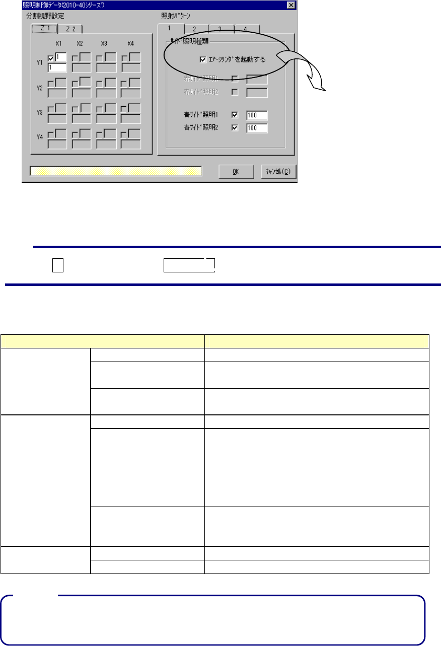 照明チェックボックス 大区分、小区分の設定により、有効になっている照