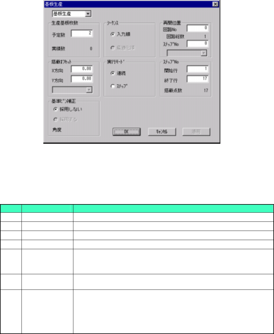 メニューバーの [生産条件−基板生産] を選択すると,基板生産の生産条件設定ダイアログが表示さ