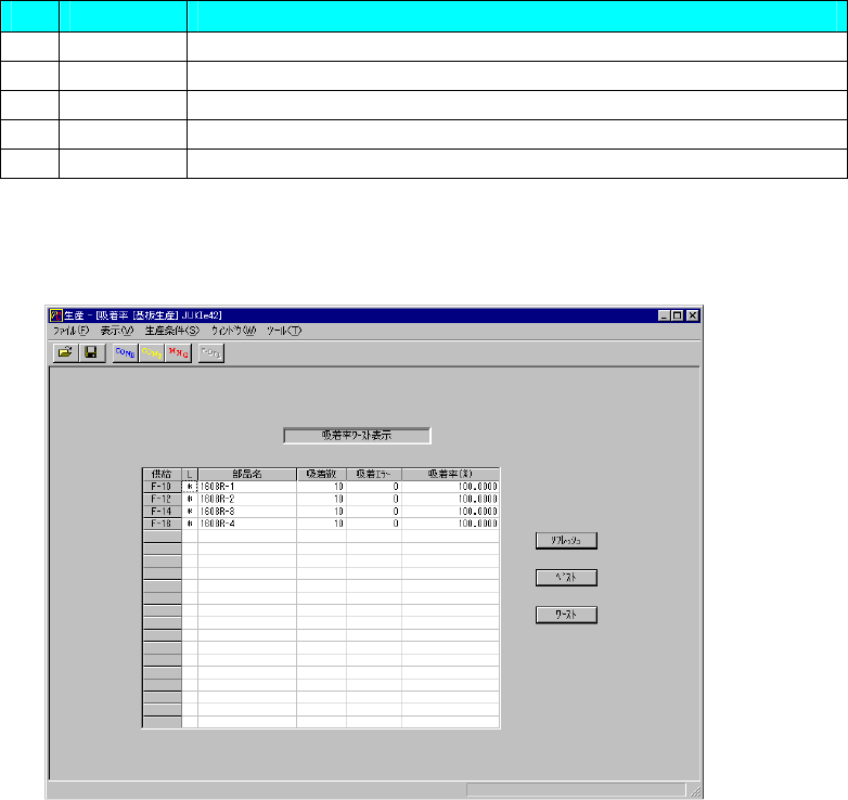 吸着率は、メニューバーの[ウィンドウ→生産管理情報→吸着率]により、