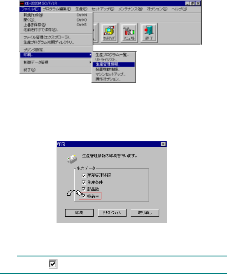 7 – 32 3) 印刷、ファイル出力 <テキストファイル>ボタンを押下し、ファイルを保存する場所を選択します。 図 図 図 図 7-2- 3-1-9 印刷 印刷 印刷 印刷 <保存>ボタンを押下すると以下のような書式のテキストファイルが作成されます。 例. 生産管理情報 JUKI KE-2020 2002/02/13 19:47:43 Page 1/2 -----------------------…