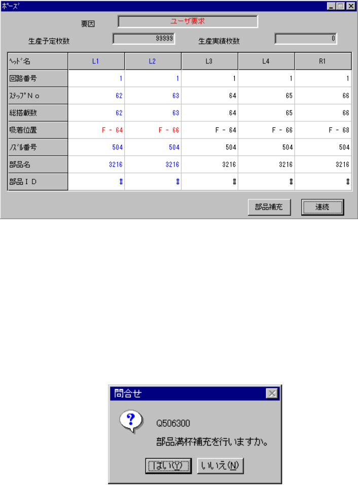 ェックされていると下図のように,生産一時停止時のポーズダイアログに<部品補充>ボタン