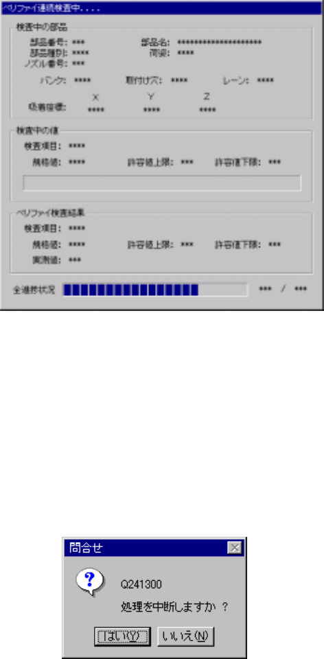 7 – 114 7-7-1-4-2. 連続検査中ダイアログ 連続検査中ダイアログ 連続検査中ダイアログ 連続検査中ダイアログ 連続検査中は以下のダイアログが表示されます。 ◇ 連続検査 を行っている 部品の内容が表示さ れ、 逐次実 行中の進捗状況と検査 結果を表示し て いきます。 図 図 図 図 7-7-1-4-4 連続検査実行中ダイアログ 連続検査実行中ダイアログ 連続検査実行中ダイアログ 連続検査実行中ダイアログ …