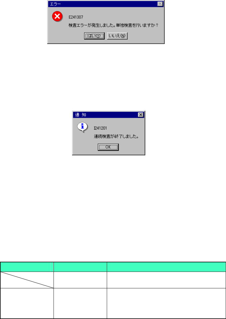 検査結果が“[OK]以外のエラー時”には、以下のダイアログが表示され、単独検査モード