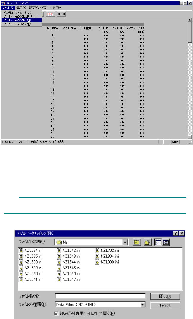 メニューバーの[ファイル]から「ノズルデータ読み出し」を選択すると「ノズルデータファイ
