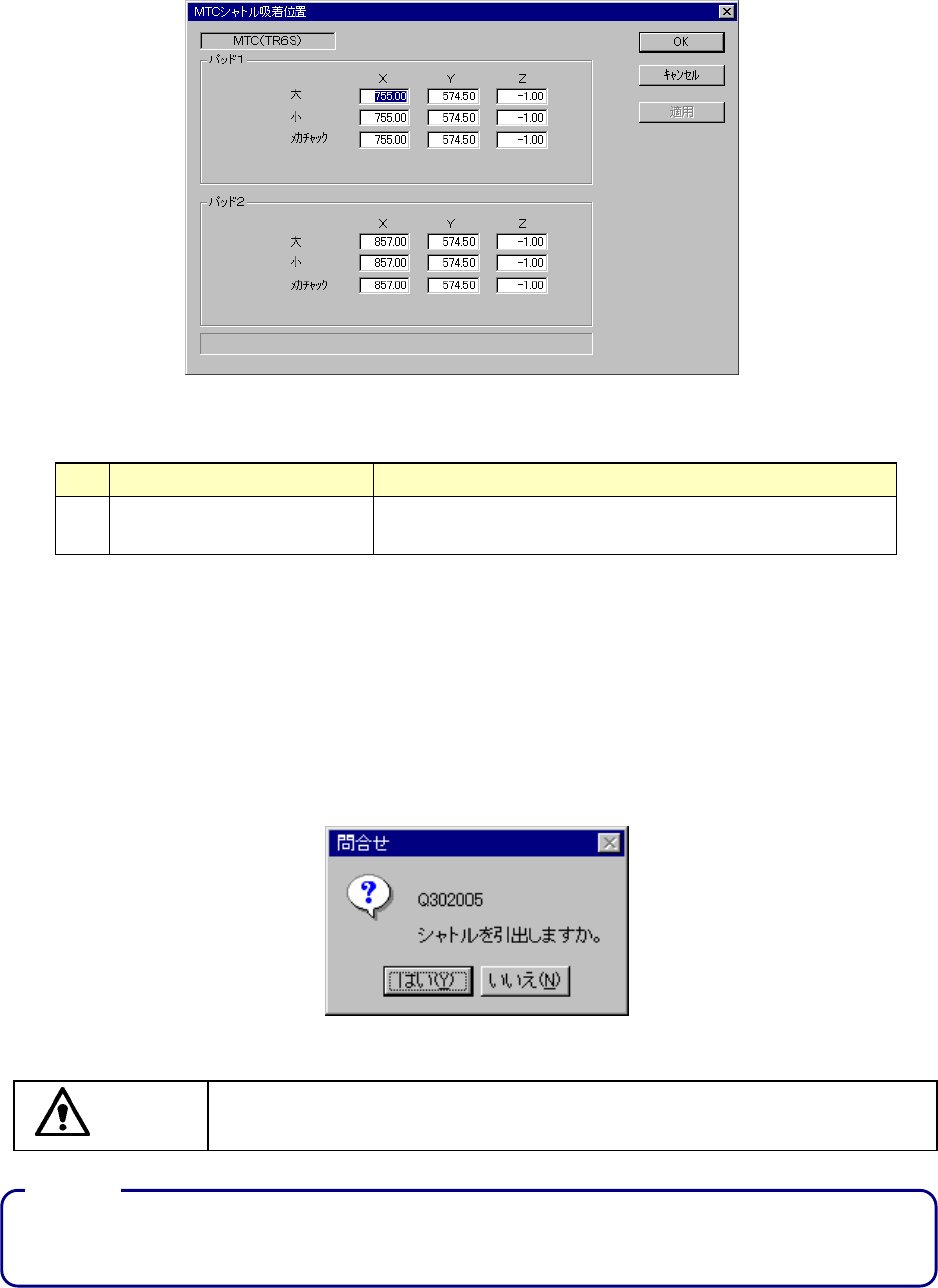 8 – 22 8-2-2-5. MTCシャトル吸着位置 MTCシャトル吸着位置 MTCシャトル吸着位置 MTCシャトル吸着位置 MTCシャトル吸着位置を選択すると、図 8-2-2- 5-1 のMTCシャトル吸着位置設定のダイアログ が表示されます。 図 図 図 図 8-2-2- 5-1 MTCシャトル吸着位置の設定ダイアログ MTCシャトル吸着位置の設定ダイアログ MTCシャトル吸着位置の設定ダイアログ MTCシャトル吸着位…