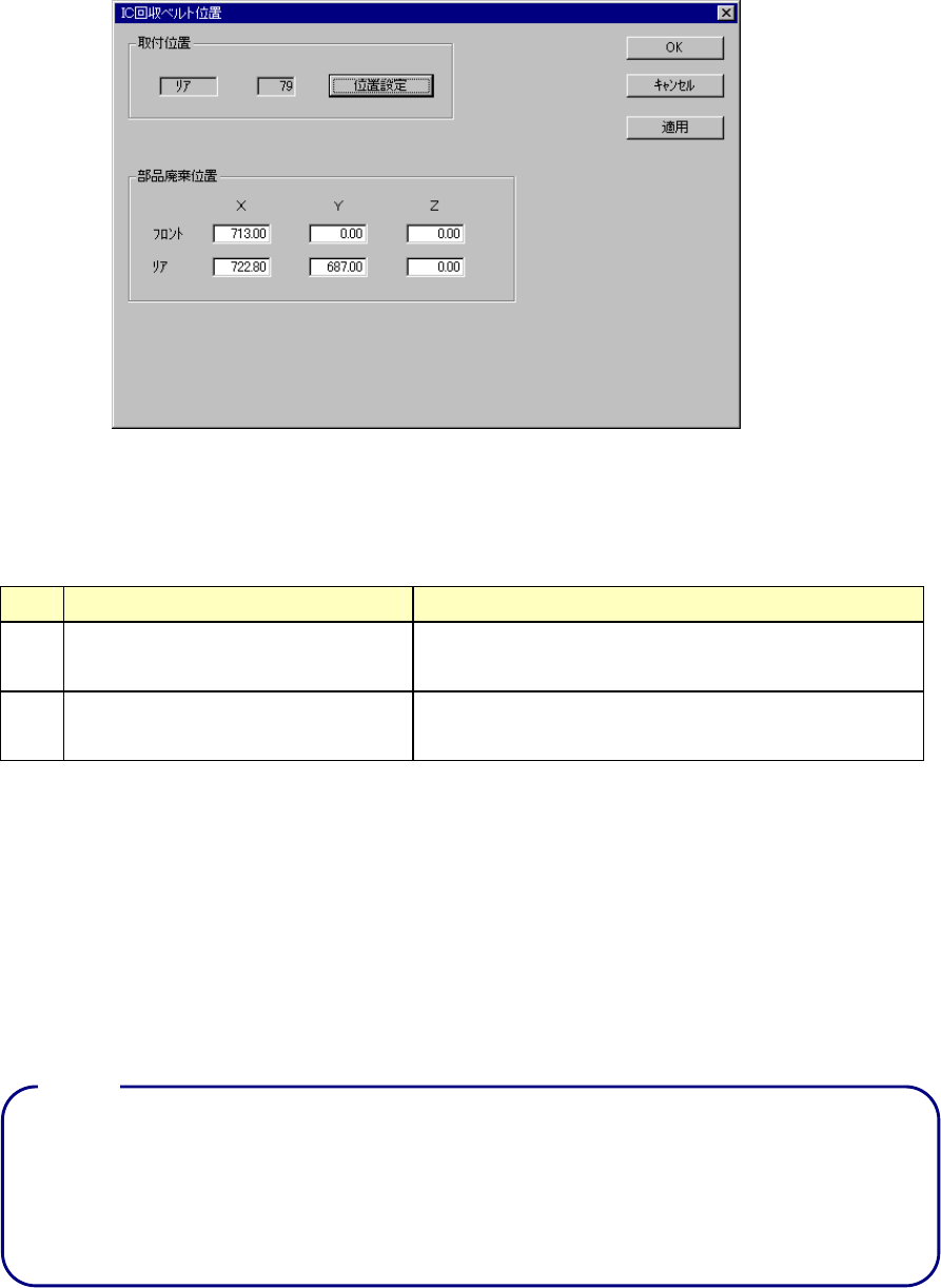 8 – 26 ② 部品廃棄位置 直接キーボードからXYZ別に入力します。 HODを使いティーチングで入力します。この場合は、入力フ ォーカスがXYどちらにあっても 同時に値が取り込まれ反映します。 Zをティーチングするときは、入力フォーカスがZにある必要があります。 図 図 図 図 8-2- 2-8-2 IC回収ベルト取付位置の設定ダイアログ IC回収ベルト取付位置の設定ダイアログ IC回収ベルト取付位…