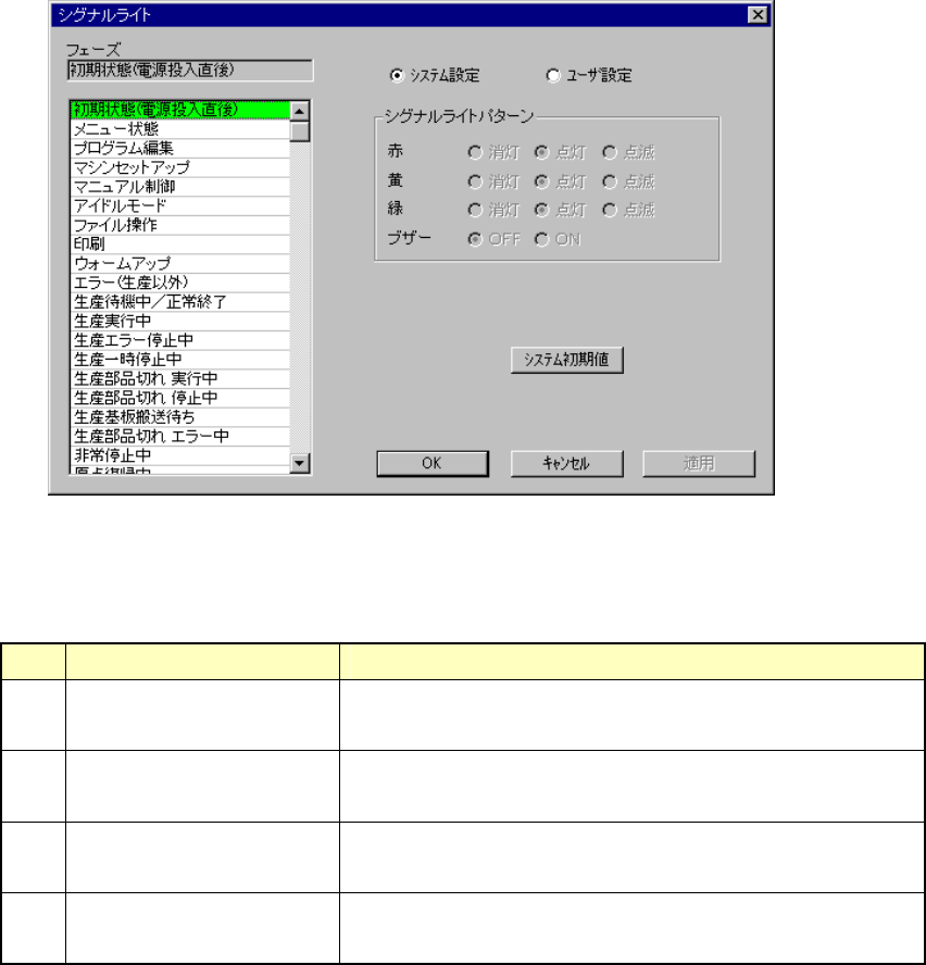 8 – 42 8-2-2-14. シグナルライト シグナルライト シグナルライト シグナルライト シグナルライトを選択すると、図 8- 2-2-14-1 のシグナルライト設定ダイアログが表示されます。 図 図 図 図 8-2- 2-14-1 シグナルライトの設定ダイアログ画面 シグナルライトの設定ダイアログ画面 シグナルライトの設定ダイアログ画面 シグナルライトの設定ダイアログ画面 (1) 設定項目 No. 項目 設定する内容 1 …