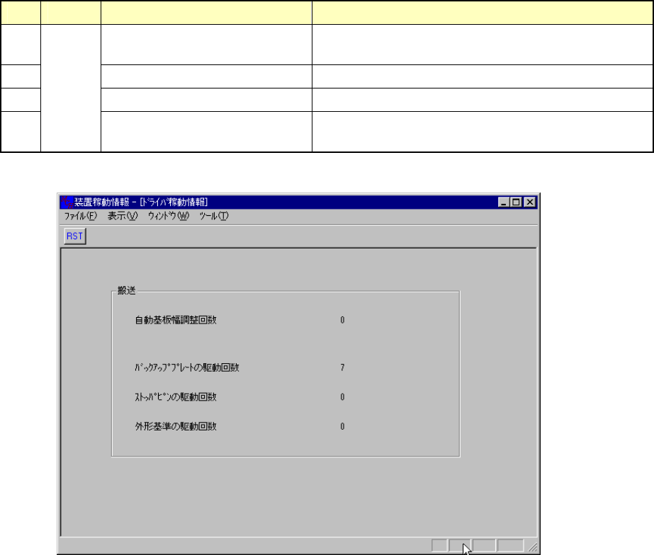 10 - 16 10-4-5. ドライバ稼動情報 ドライバ稼動情報 ドライバ稼動情報 ドライバ稼動情報 メニューバーの [ ウィ ンドウ ( W ) → ドライバ稼動 情報 ] を選択すると、 図 1 0-4-5-1 が表示さます。 NO NO NO NO 分類 分類 分類 分類 項目 項目 項目 項目 内容 内容 内容 内容 1 自動基板幅調整情報 最後に稼動情報をクリアしてから、 自動基板幅調整が行わ れた回数の累計。 2 …