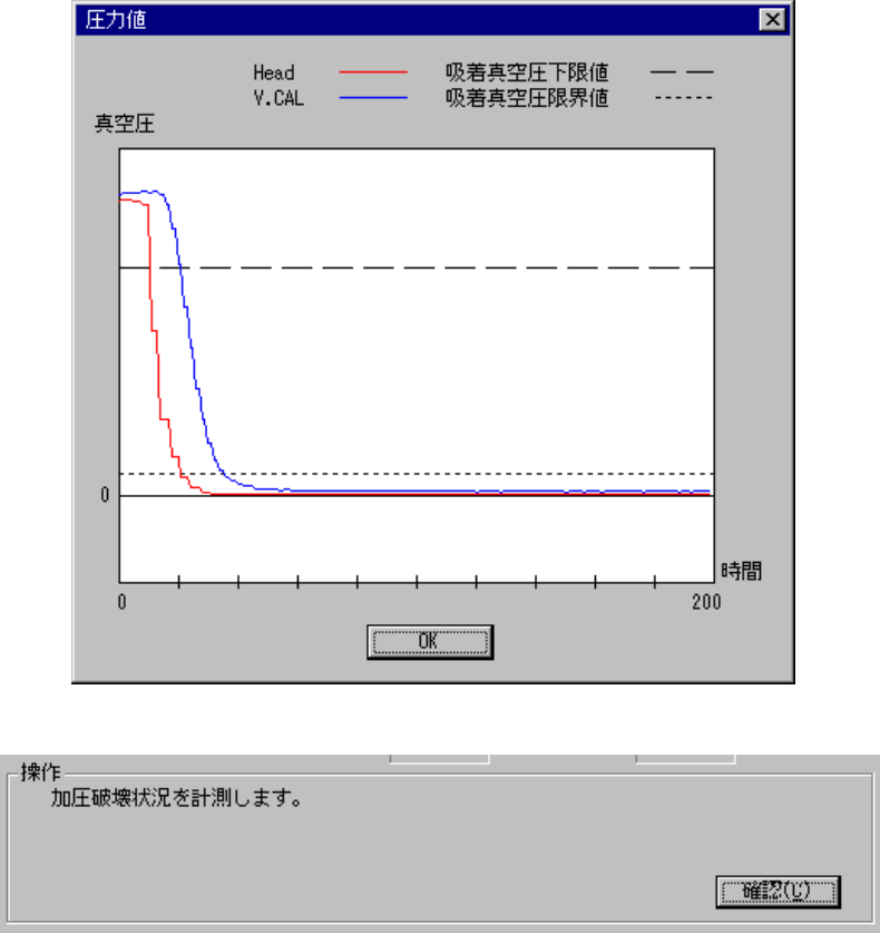 11 - 18 ◆ 計測内容 ① 設定ヘッドがバキュームキャリブレーション上に移動し、 真空到達状況を 3 回計測します。 ・ 2 回目と 3 回目の平均値が表示されます。 ・ 計測後に表示される圧力値のグラフは、 3 回目のデータです。 設定ヘッドで選択したヘッドを設定します。 <確認>を選択して下さい。 <確認>を選択すると、自然破壊状況を自動で計測します。