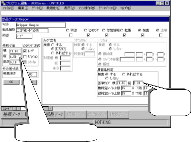13 - 24 ④ 異部品検査の場合の注意 異部品検査を指定する場合は基準サイズに注意してください。 ◆ 基準サイズはレーザを当てる面でのモールド部のサイズであり、リードまで含め る外形寸法と は異なります。 図 図 図 図 13 13 13 13- - - -1 2 12 12 12- - - -7 7 7 7 異部品検査指定の設定 異部品検査指定の設定 異部品検査指定の設定 異部品検査指定の設定 リードを含 む部品外形の縦の寸法 …
