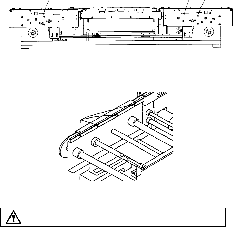 14 - 10 14-2-7. 搬送プーリ 搬送プーリ 搬送プーリ 搬送プーリ プーリがスムーズに回転するか確認して下さい。 交換が必要な場合,以下の方法で交換して下さい。 (1) 搬送プーリの交換 1) 搬送プーリは図 14- 2-7-1 ~ 3 のように前後レールプレートに取り付けられています。 取り 付けねじを緩め,搬送プーリを交換して下さい。 2) 搬送ベルトの交換と同様に搬送ベルトのテンション調整を行って下さい。 危険 不意の…