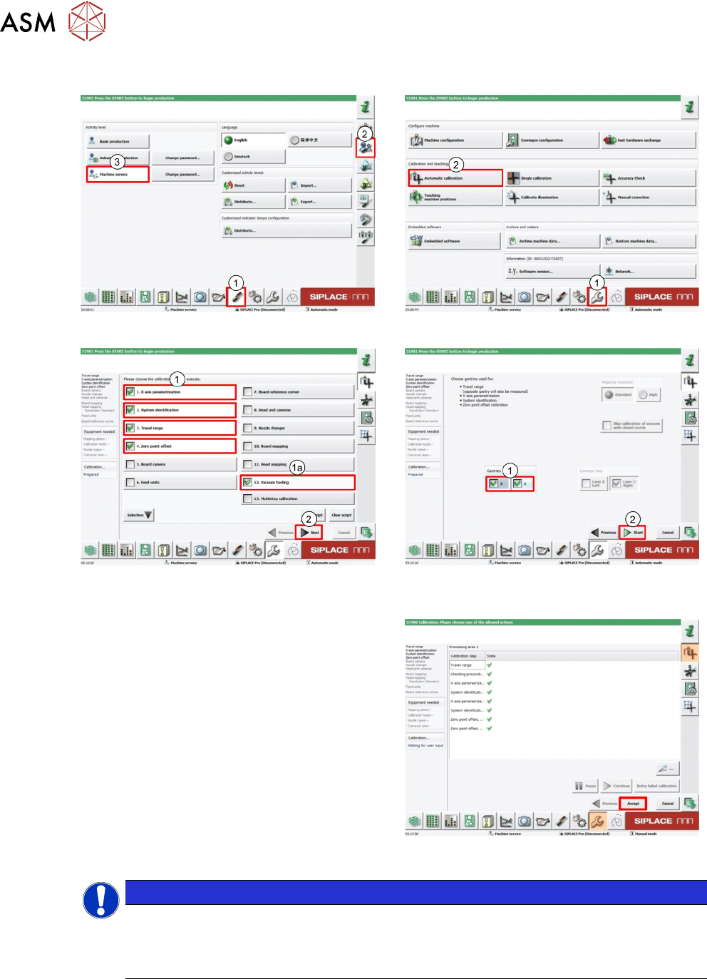 1. Log on as Machine service (1-3). 2. Select Automatic calibration.