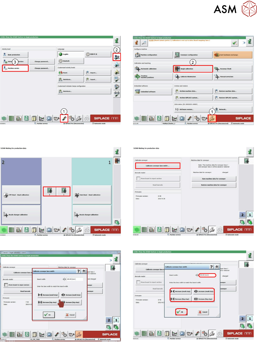 7 Conveyor System 7.5 Parts Exchange / Settings / Calibration Technical Training SIPLACE TX-Series 10/2016 181 7.5.2.3 Calibrating the conveyor width 1. Log on as Machine Service (1-3). 2. Click Calibration (1). Select S…