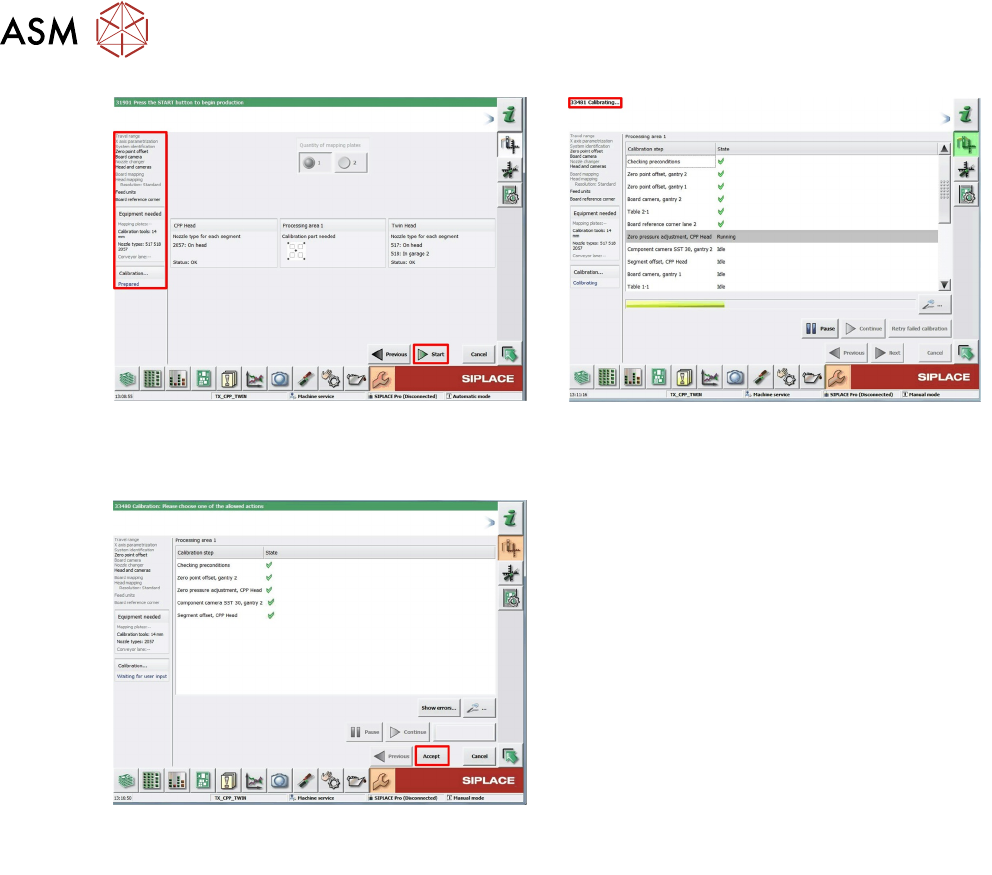5 Placement Heads 5.1 CPP Head Technical Training SIPLACE TX-Series 10/2016 75 5.1.7.2 Calibration Steps 1. Log on as Machine service (1-3). 2. Click Calibration (1). Click Automatic calibration (2). 3. Under pull down m…