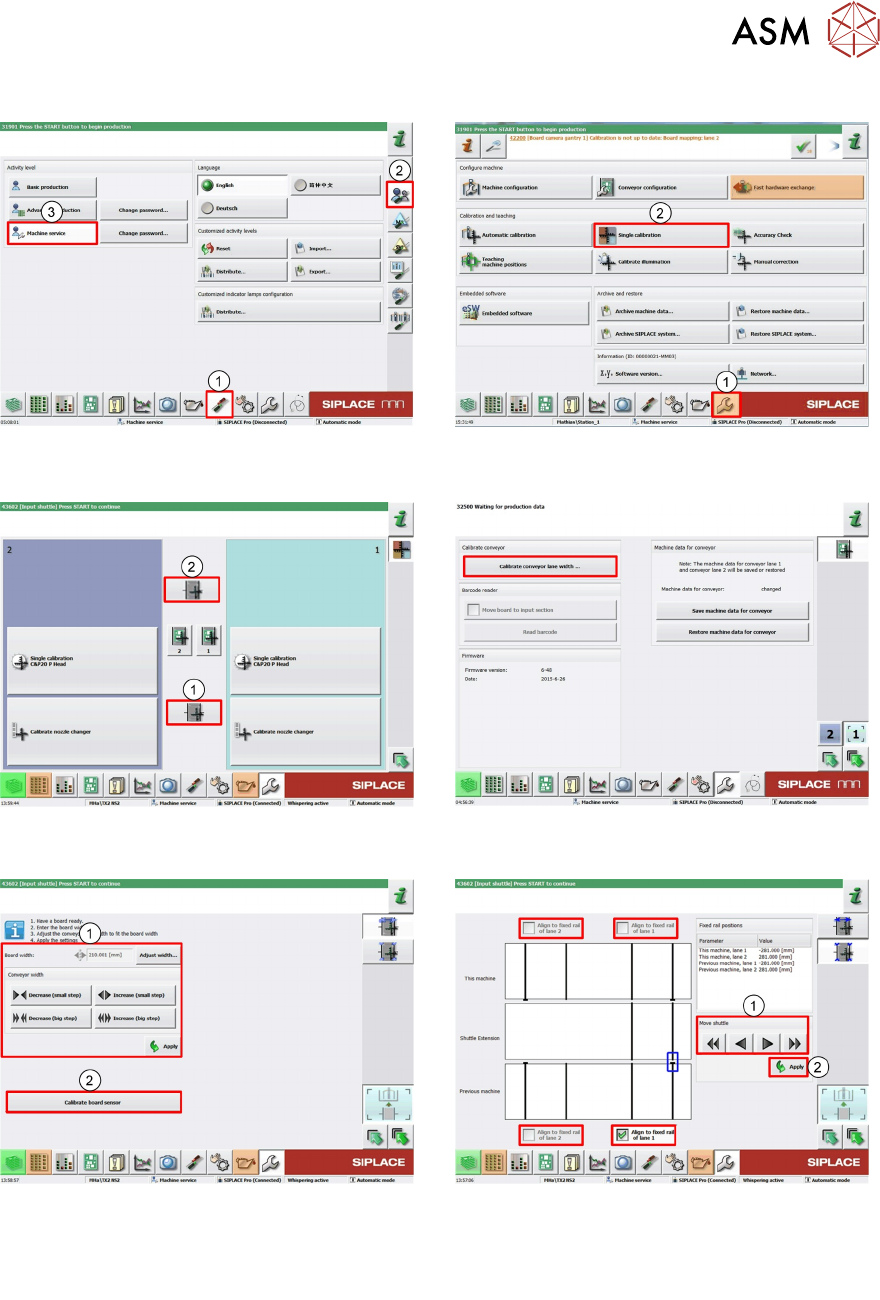 7 Conveyor System 7.5 Parts Exchange / Settings / Calibration 186 Technical Training SIPLACE TX-Series 10/2016 TX shuttle single function and test function menu ► Click on Check Sensors and Functions menu. ► Click on Sen…