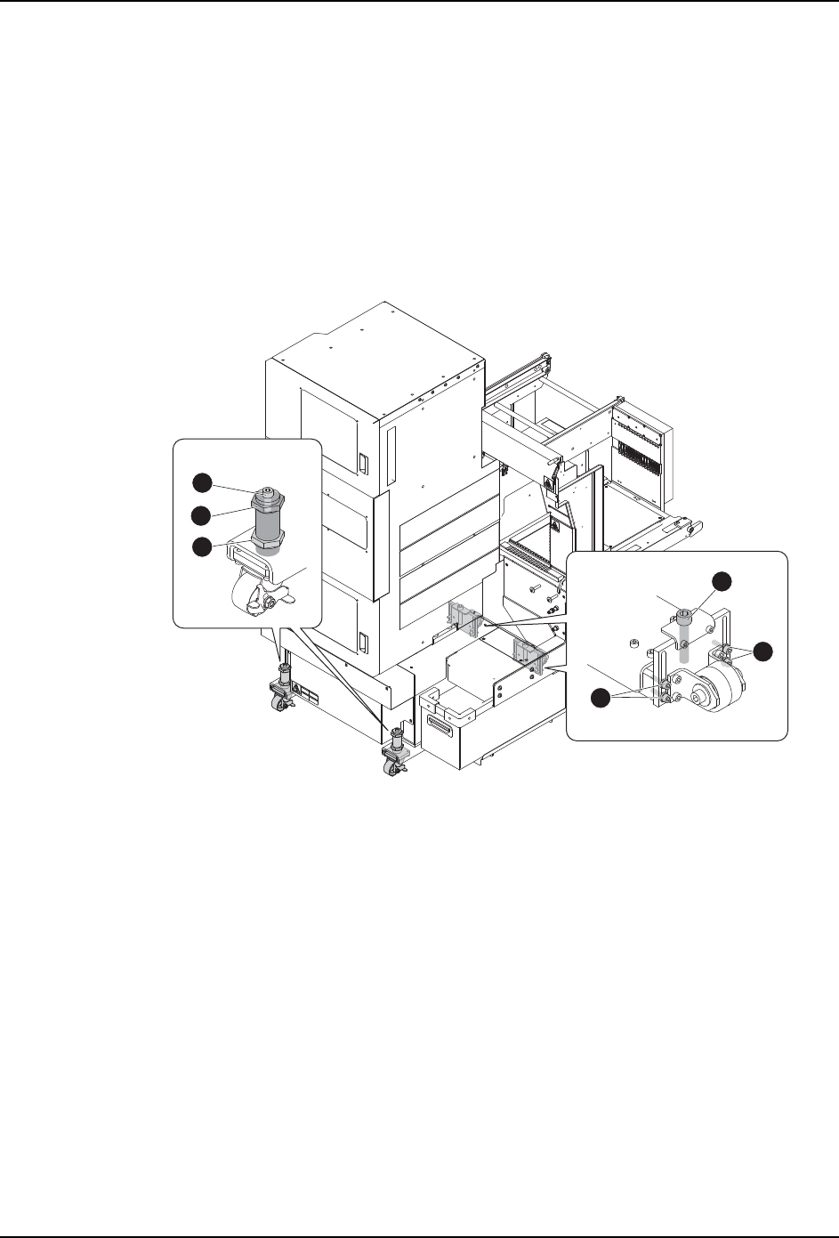 2. 请拧松后侧脚轮部的螺栓 (4)。旋转调整螺栓 (5) 调整高度。