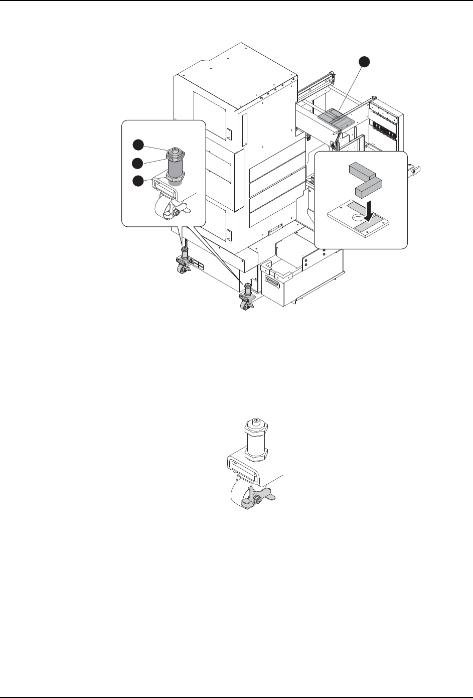 1. 请拧松面前侧脚轮部分的螺栓 (1),拧松锁定螺母 (2)。旋转调整螺栓 (3) 调整高度。