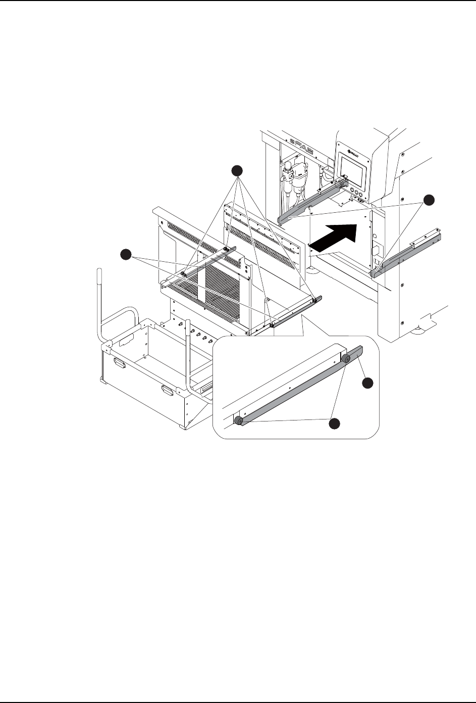 机器本体侧的导轨 (5) 内侧定位,使滚轮 (3) 坐在导轨 (5) 表面慢慢地压入本机内。压
