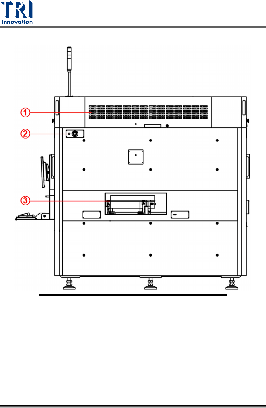 Test Research, Inc. TR7600 SII I Series User G uide – Maintenance 7 1.7 Left Side View of the System Figure 7: Left Side View 1) Left Modu le Board Box 2) Left Gate 3) Emergency Stop 4) Adjustable Co mputer Table Lock