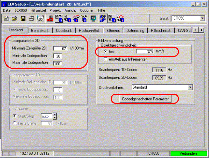 : Die automatisch ermittelten Parameter Transportgeschwindigkeit, Modulgröße und die Opti-