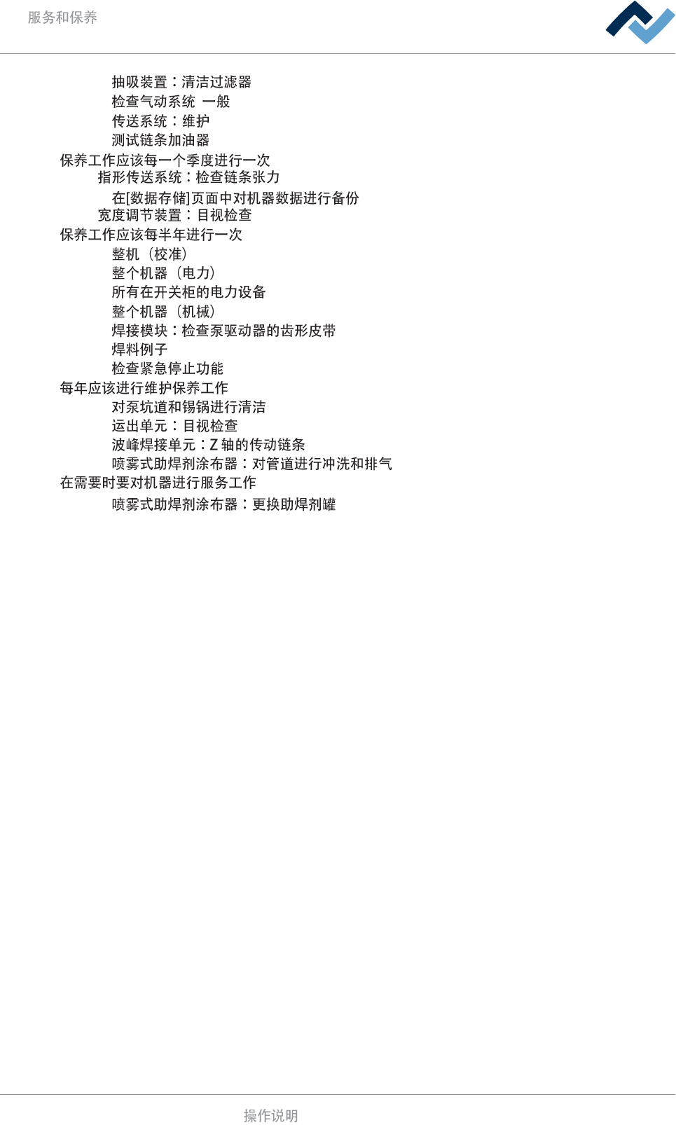 Powerflow_zh | Re v. 4a Ersa Gm bH 385 / 561 8 | 8.1 在每个班次 之前 5 分钟 8.4.2 传送链条的盖子:目视检查 在每个班次 之前 5 分钟 8.4.3 传感器:目 视检查 在每个班次 之前 15 分钟 8.4.1 对传送系统进行常规目视检查 在每个班次 之前 15 分钟 8.4.4 锡波:目视检查并进行润湿测 试 在每个班次 之前 30 分钟 8.4.5 波峰焊接单元:移除碎屑…
