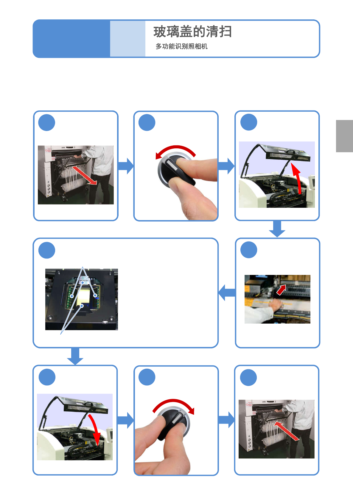 NPM-W2 EJM7DC-MB-05M-00 安装交换台车 ( → P.3-2) ( ) 5 除去玻璃盖上的灰尘 ●请注意勿使遮光板变形。 ( 如果变形,是造成识别错误 的原因。 ) 对多功能识别照相机的 玻璃 盖的清扫进行说明。 使用工具 : 棉纱布等 所 需时间 :5 分钟 ( 前侧和后侧合计的时间 ) ● 当后侧为托盘规格时,在进行玻璃盖 的清扫之际,请根据需要使用脚踏凳。 3 5-4 ●注意不要损伤玻璃盖表面, 使用柔软棉纱布…