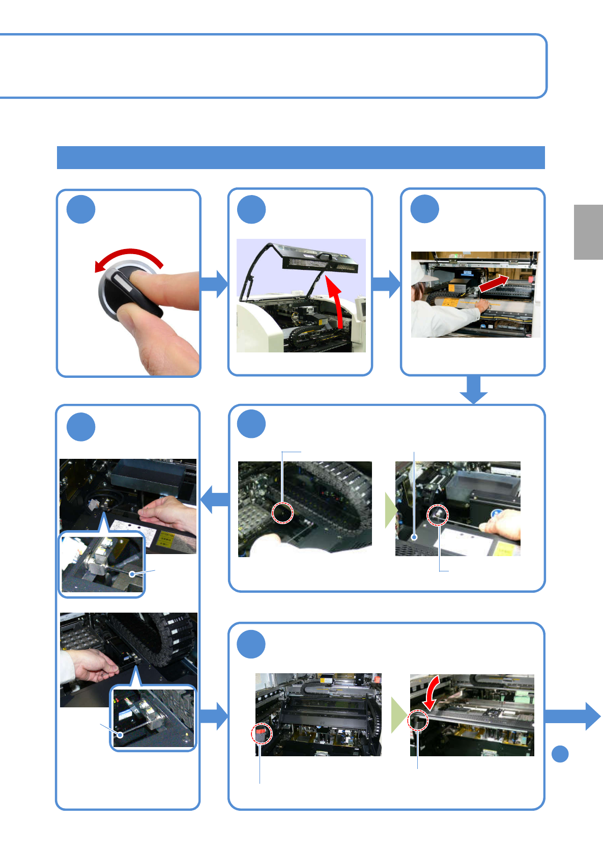 NPM-W2 EJM7DC-MB-03M-00 料架工作台盖的安装方法 1 4 安装料架工作台盖 料架工作台盖 导销部 顺序 7 3-3 -2 5 固定料架工作台盖 六角扳手 (3 mm) 安全开关 导销部 定 期 检 查 OFF SERVO 1 3 2 把 X 轴往内推 6 ( 左右各有 1 个螺丝 ) 六角扳手 (3 mm) 确认料架工作台盖的键已插进 安全盖开关中 确认料架工作台盖的安全开关的吻合状态