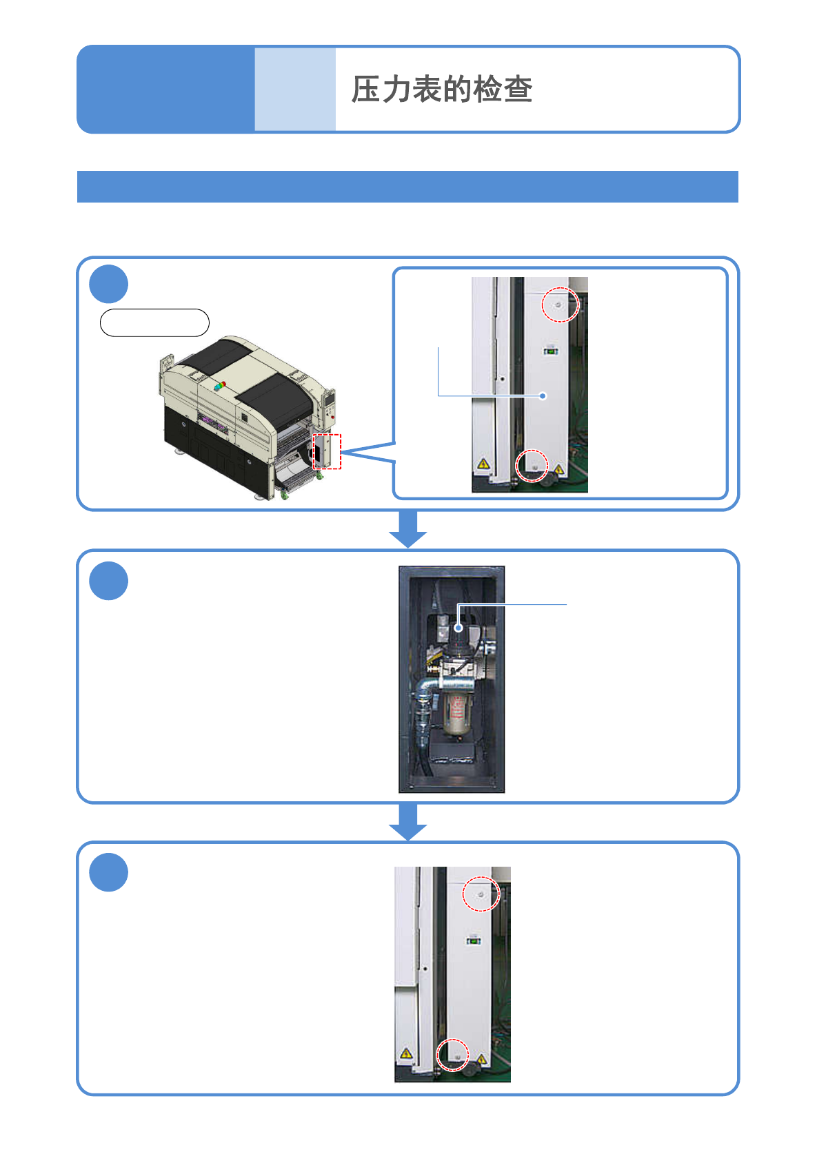 NPM-W2 EJM7DC-MB-04M-00 工作 开始前 4-1-1 -3 维修保养篇 4 - 1 - 1 调整气压 ( 主气压 ) 使用工具 : 六角扳手 (3 mm) 所需时间 :3 分钟 ●主气压在规定值以外时,请调整。 2 1 拧松螺栓,卸下后侧压力表的保 护盖 2 调整到规定值范围内 主气压用 调节器旋钮 ●调节器旋钮的操作方法 1 : 解锁。 2 : 调整。 3 : 上锁。 3 安装后侧压力表的保护盖 ●螺栓 : 2 个…