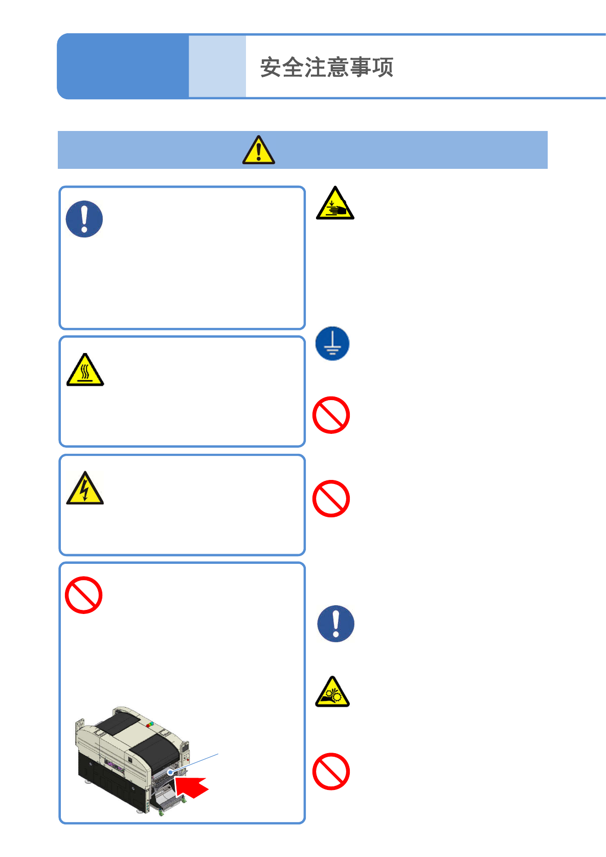NPM-W2 EJM7DC-SF-01N-00 请勿在设备、周边器材、可动 部上放置其他物体或者站立在 上面 ( 重物掉落引起破损或者被夹住,可能受 伤 ) ●安全盖、交换台车等 1-1 -8 遵守“安全数据表 (SDS) ”的 注意事项 ( 化学物质引起危害和损害的原因 ) ●“安全数据表 (SDS) ”,请参阅 使用说明书的『维修保养篇』。 维修保养时,请戴工作帽或安 全头盔以及保护眼镜 ( 可能受伤 ) ●马达或电气箱等。 搬运料…