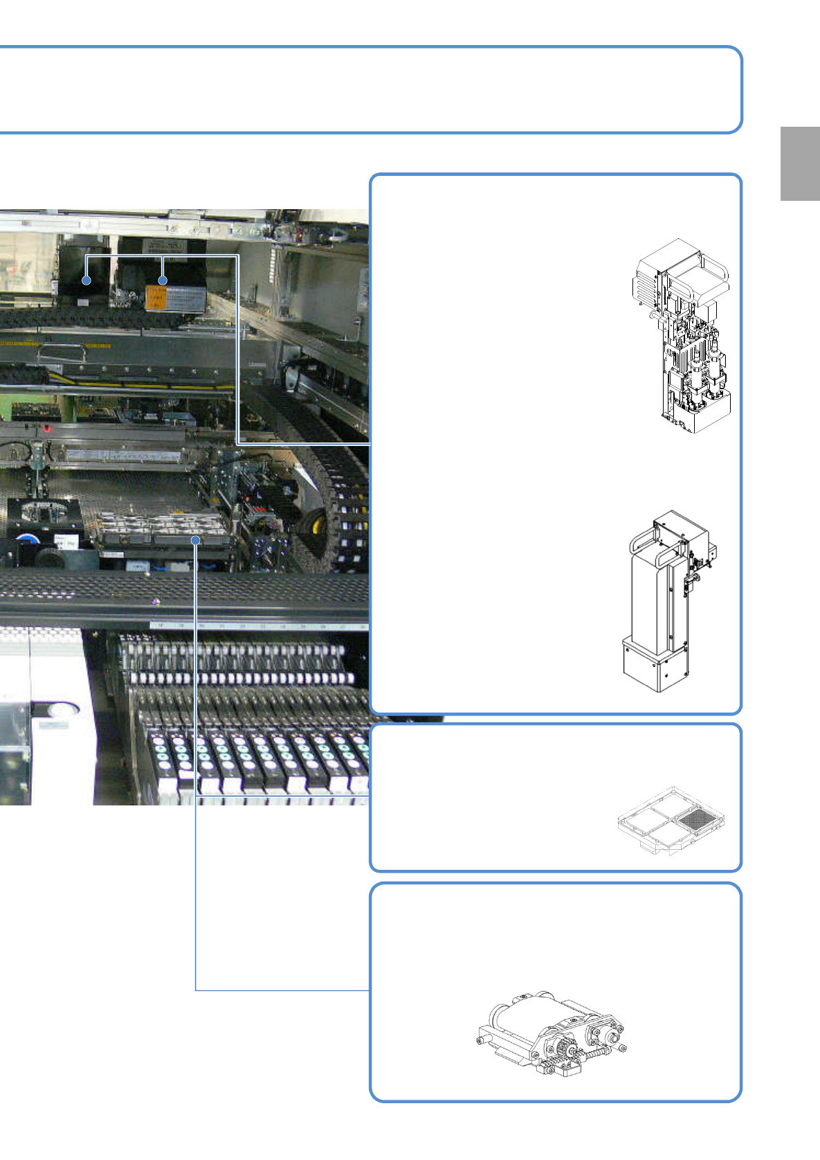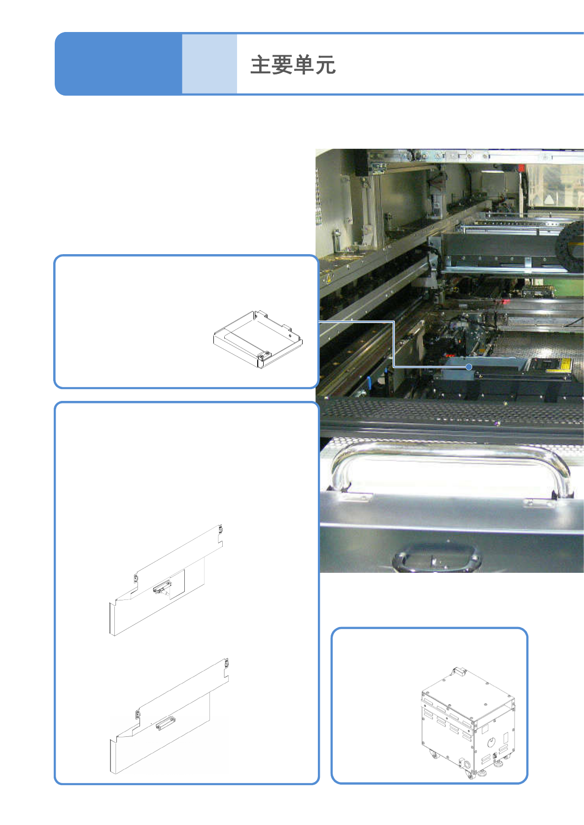NPM-W2 EJM7DC-SF-01N-00 1-9-3 -4 点胶头 (选购件) 在基板高速且高精度点 胶 粘着剂。 2D 检查头 (选购件) 拍摄被检查基板的状态 , 将所摄图 像导入检查 BOX 。 ●图像分辨率有 18 μ m (类型 A ) 和 9 μ m (类型 B )的 2 种类 型。 试点胶单元 (选购件) 试点胶动作时进行试点 胶 编带的卷送。 2D 检查用校正治具 (选购件) 2D 检查头的校正时使用,是以…