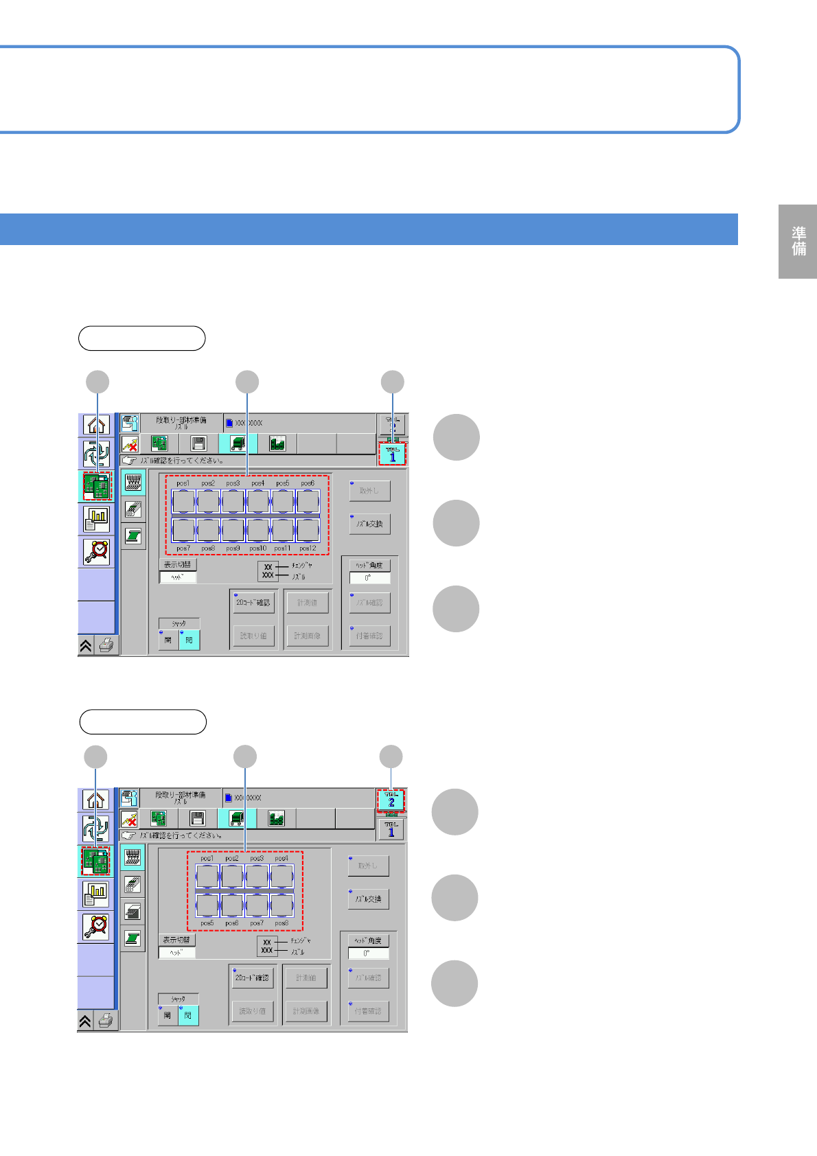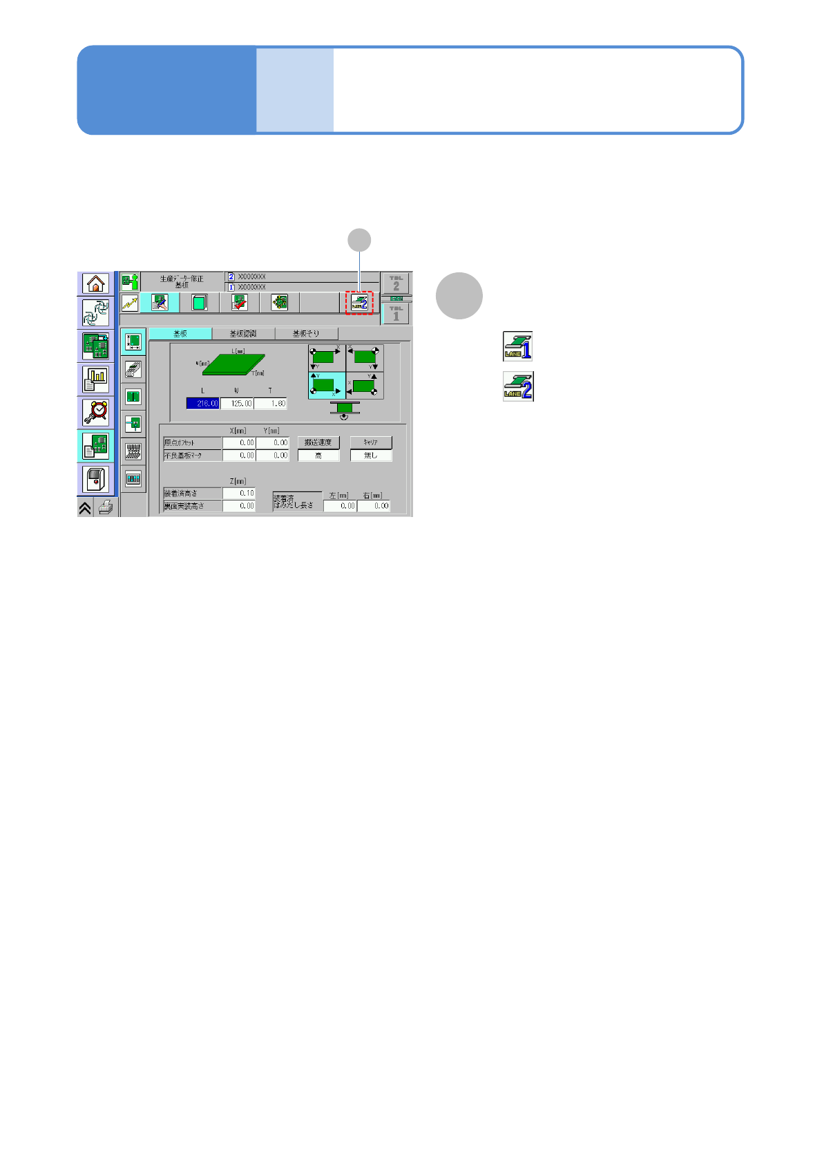 NPM-W 2 EJM7DJ-MB-02O-00 2-2-1 -9 各部の 名称 タッチパネル 5 デュアルレーンモードを選ぶと、レーン 1 、 レーン 2 を切り替えられま す。 レーン切り替えボタン A A 操作編 2-2-1 ●押すたびに、モードが切り替わる 。 : レーン 1 : レーン 2 ●ボタンが無効になっているとき、また はひとつのレーンにしか生産データが インストールされてないときは、切り 替わらない。