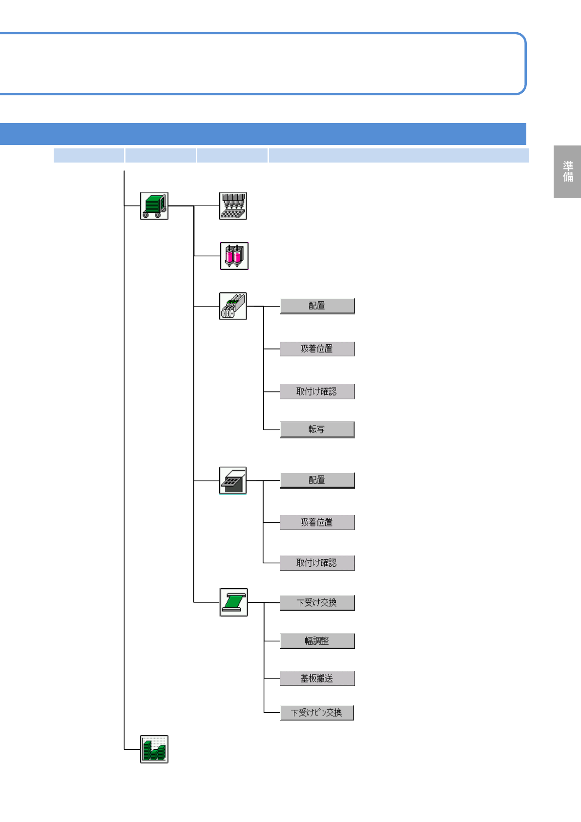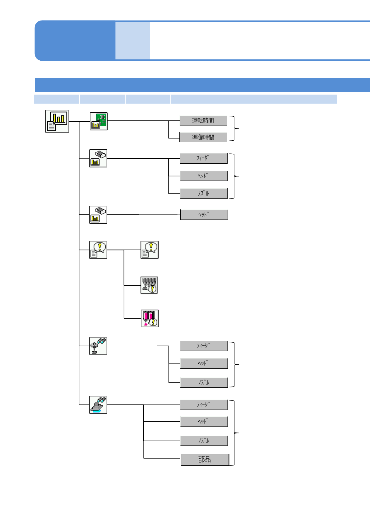 NPM-W 2 EJM7DJ-MB-02O-0 0 第 1 階層 第 2 階層 第 3 階層 第 4 階層 2-2-2 -3 オペレーターモード 2 各部の 名称 メニュー構成 2 操作編 2-2-2 吸着情報 生産情報 メニュー ステージごとの稼働時間情報を 表示する。 非常停止エラーの停止情報を、時刻が新しい順に最 大 20 件 表示する。 停止履歴 自動運転中に発生した真空センサーに関するエラー 情報を 新しい順に 50 件表示す…